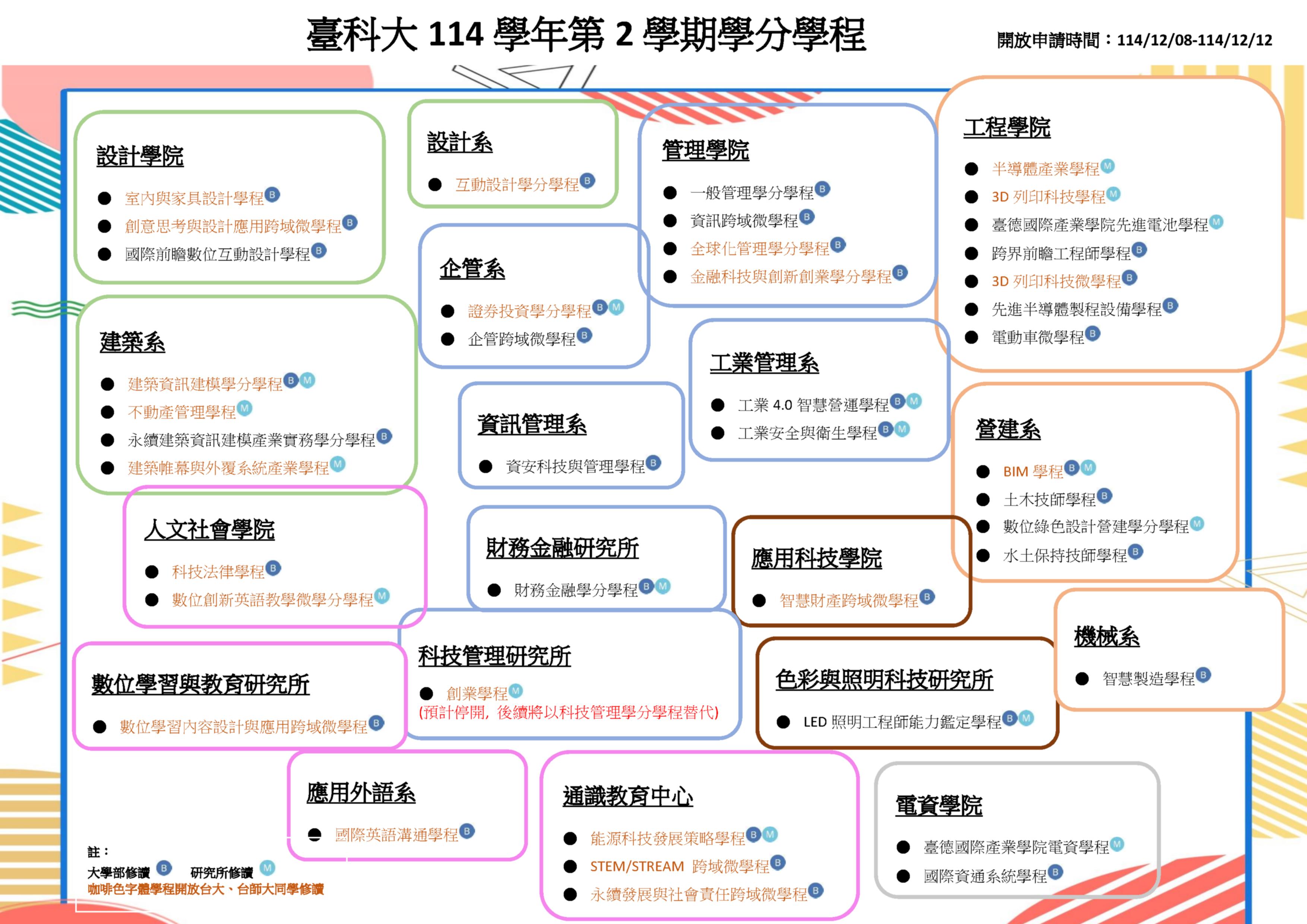 114-1 本校開放臺大及臺師大學生申請修讀學分學程一覽表 臺大部分學分學程114學年度第2學期申請修讀,將於114年11月1日開放線上申請系統,有意申請修讀同學,請至國立臺灣大學系統跨校學分學程資訊共同平台(網址https://ifsel3.aca.ntu.edu.tw/cou_stu/index.php/alliance)查詢相關資訊。 |